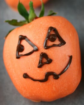 - Meanwhile, pour chocolate chips in the pastry bag. Microwave on high for 1 minute. Massage bag until chips are completely melted. Cut a tiny corner at the tip of the pastry bag. Remove "pumpkins" from the refrigerator and decorate by piping chocolate faces on strawberries or you can also do stripes. Refrigerate for another 15-20 minutes or until completely set. Serve immediately or store in refrigerator for up to 2 days.