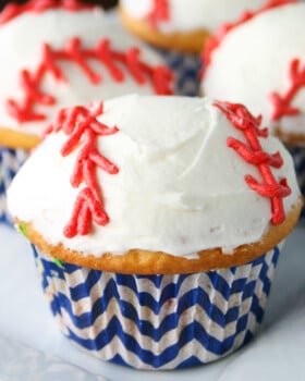 - Beat softened butter on medium speed with an electric or stand mixer. Beat for 3 minutes until smooth and creamy. Add powdered sugar, cream, and vanilla extract with the mixer running. Increase to high speed and beat for 3 minutes. Reserve one cup of frosting and color it red. Use remaining white frosting to frost the cupcakes. Create a dome shape with the frosting and smooth with an offset spatula. Scoop red frosting into a pastry bag fitted with a #3 pastry tip. (Or you can use a tube of store bought red frosting, preferably with a small round tip.) Pipe baseball thread design onto cupcakes. Refrigerate for 1-2 hours, if you have time, so the icing can set.