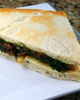 Cut the sandwiches in half diagonally and serve. With the sweet and sour onions, garlic mayo, cheese, spinach and chicken, this panini packs a lot of flavor in between the pizza dough flatbread. Superb!