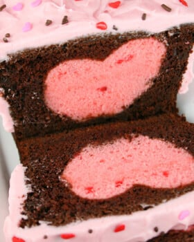 This super cute Chocolate Covered Strawberry Heart Cake is a chocolate loaf cake with a surprise inside – heart shaped strawberry cake. Frosted with a light and fluffy strawberry cream cheese buttercream, then topped with sprinkles for the perfect Valentine’s Day dessert! (Also known as a Hidden Heart Valentine Cake or a Chocolate Strawberry Surprise Inside Cake.)
