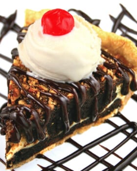 Cream Cheese Brownie Pie – a brownie and delicious cheesecake swirled together and baked in flaky pie crust. Served with ice cream and hot fudge, it’s like a fancy restaurant dessert experience!