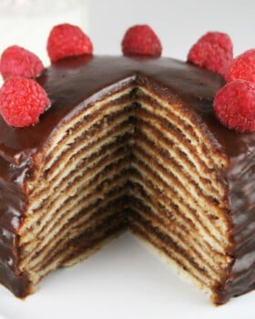 - Place a rolled pancake on a wire rack set over a cookie sheet. Spread with a couple of tablespoons of the icing, letting the excess run down the sides. Stack the remaining pancakes, icing each layer. Pour the remaining icing over the top of the cake. Place raspberries on top. Refrigerate until icing is set, about 1 hour.