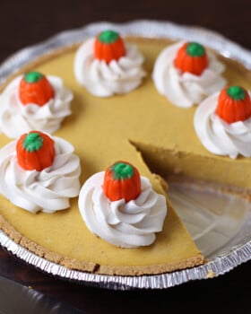 Gluten Free Dairy Free Pumpkin Cheesecake has all the cozy flavors of a classic pumpkin pie! Plus, it’s creamy and delicious! And as a bonus, it’s even lowfat!