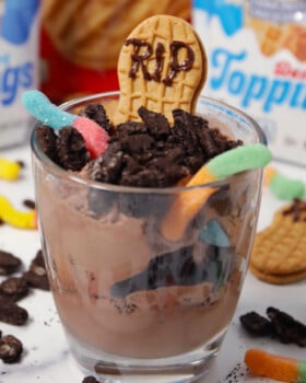 First you scoop chocolate ice cream into a medium glass. Add a small handful of crushed OREO cookies and a couple of gummy worms. Repeat these steps a second time. Then top with a peanut butter cookie “tombstone” (I used Nutter Butter cookies).