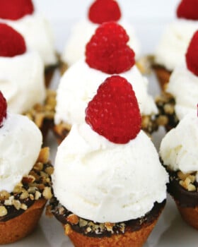 Add a small scoop of vanilla ice cream and a fresh raspberry to each cookie cup that you plan on eating right away. Store the rest covered for up to a few days. You can add the ice cream to them when ready to serve again.