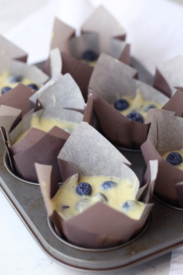 - Preheat oven to 400°F. Line a 6-cup muffin pan with cupcake liners. Set aside. (Note: I used "Tulip" cupcake liners which I found at my local grocery store, Kroger. They are also available online. It's important to use these liners if you want your muffins to rise up as shown in the photos in this post. Otherwise, if you use regular cupcake liners, they won't rise up as much but still taste delicious. You can get about 8-10 smaller muffins if you use standard sized cupcake liners.)
