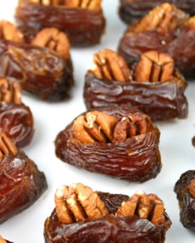 Have you ever had Medjool Dates? They are the best dates I’ve ever eaten. Soft, tender and sweet. And they make this easy treat even better. Just 3 ingredients. Toasted pecans, dates and powdered sugar. Pecan Stuffed Dates are simple and delicious! Plus, they’re gluten free!