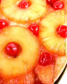 Pineapple Upside-Down Pizza tastes a lot like the cake version, but a lot easier to make. The pizza crust takes the place of the cake batter, so you can put it together really quickly!