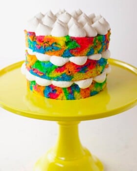 Slice and serve this cheery Rainbow Tie Dye Cake at your next BBQ or dinner party! It’s sure to bring smiles from all your guests, young and old!