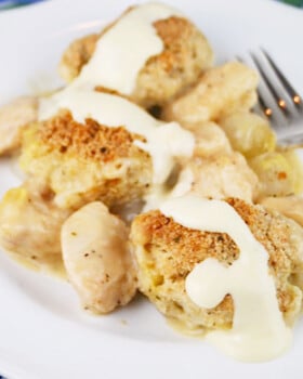 You also make a sauce with cream of chicken soup and water. Heat and mix until it's melted and combined. Place the veal (chicken) pieces in a casserole dish. Pour the sauce over it. Then dump the drained onions in. Place the dumplings on top and bake.