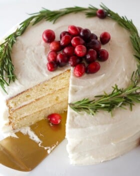 Simple Christmas Cake is a white velvet buttermilk cake, topped with a delightful cream cheese frosting then garnished with fresh rosemary and cranberries. Perfect for your holiday dessert table!