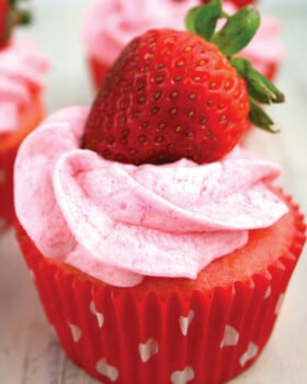 Can I use a different flavor cake mix? Yes! The strawberry buttercream frosting pairs very well with vanilla or chocolate cupcakes.
