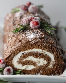 Today I’m sharing this beautiful, made from scratch Yule Log Cake which is also called a Bûche de Noël (so fancy). It’s a light, airy chocolate sponge cake that is rolled up with a whipped cream filling and chocolate buttercream frosting on top.
